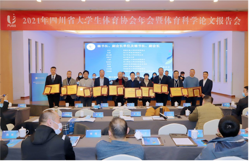 四川省大学生体育协会会长杨远波为协会部门负责人颁发聘书。会上,四川省大学生体育协会副会长邓跃宁宣布科报会论文获奖和课题立项名单。