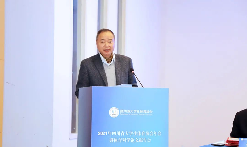 陈朝先代表省委教育工委、教育厅在大会上讲话。他代表四川省教育厅对年会的顺利召开表示热烈地祝贺。陈朝先指出,2021年四川省学校体育工作取得了显著成效,主要表现在学校体育工作的顶层设计不断完善、足球育人成绩显著、以“贡嘎杯”为代表的品牌赛事日益成熟、高校担当积极作为、体教融合在实践中深化。陈朝先强调,成绩取得的同时也要看到问题的存在,如高校学生体质健康监测数据比基础教育阶段明显偏低;多数学校未能落实全学段开设体育课及体测达标方可毕业的要求;高校服务地方经济社会发展动力不足、能力不足等。最后,陈朝先对到会的高校爱体育在线登录书记、院长提出殷切期盼, 一要牢记育人初心使命,坚持“健康第一”教育理念;二要对标竞进改革创新,努力实现自身进步和体育工作整体提升;三要服务地方担当作为,支持地方经济社会发展与基础教育阶段学校体育工作。