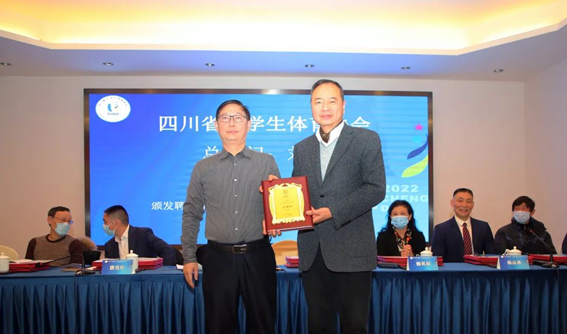 四川省教育厅体卫艺处一级调研员赖英莉为副秘书长单位授牌、为副秘书长发聘书。