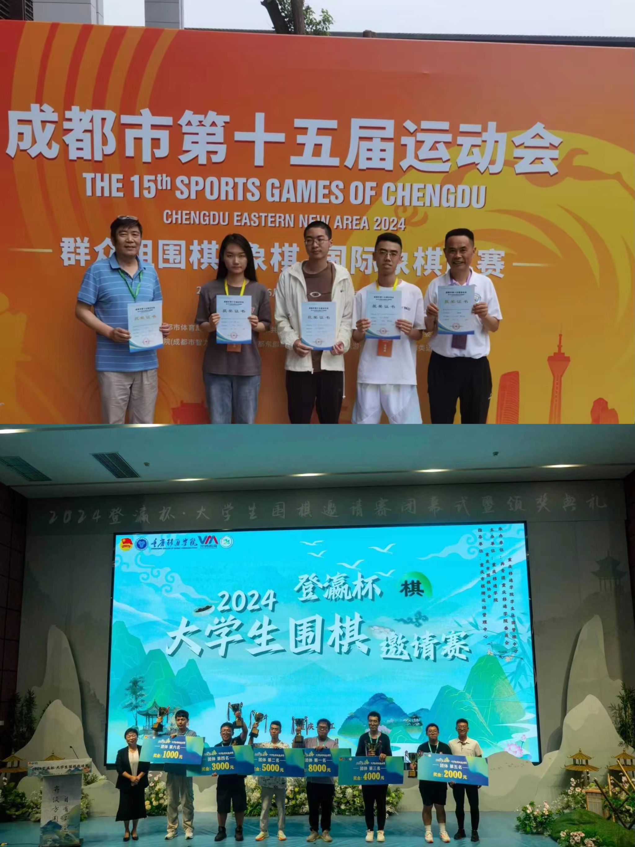 在成都市第十五届运动会群众组围棋比赛和在2024登瀛杯·大学生围棋邀请赛中,由王军和吴小丹老师带领,李锦澎、郭品瀚、曹子文、王冠桥、李赵晗同学组成的爱体育(中国)围棋队分别取得了男子个人第八名、女子个人第八名、团体第五名和团体第二名,个人第七名的优秀成绩。