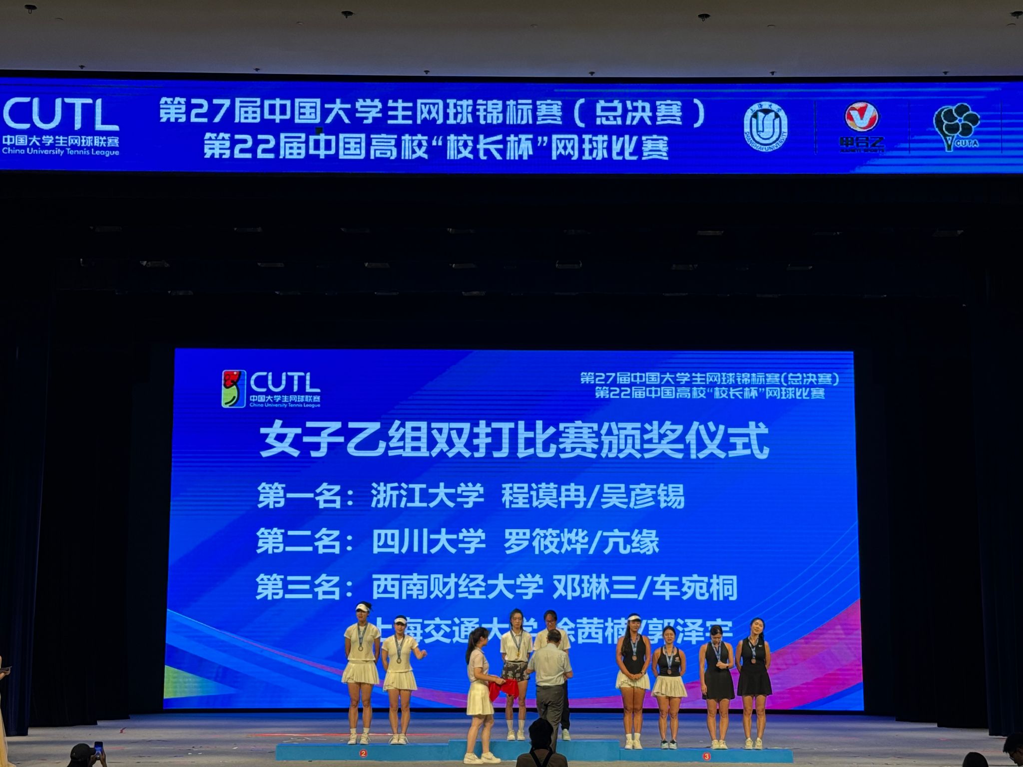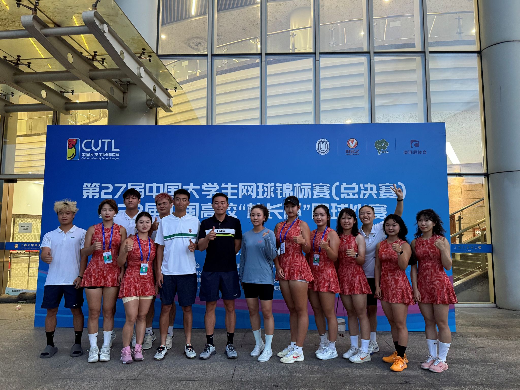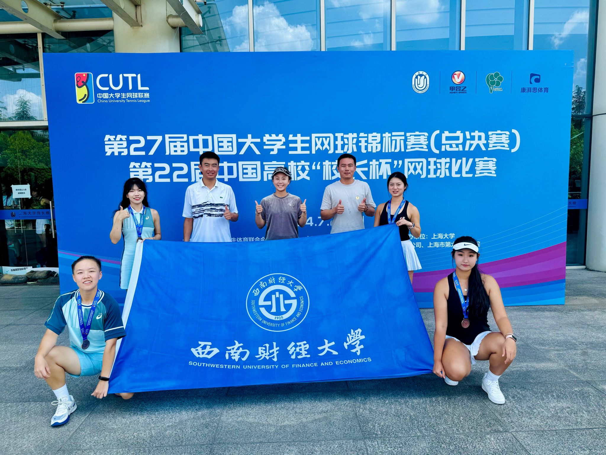 7月22日-8月1日,第27届中国大学生网球锦标赛(总决赛)在上海大学(宝山校区)举行。中国大学生网球锦标赛是我国大学生层面最顶级的网球赛事,经过八大分区赛的激烈角逐,在本届中国大学生网球锦标赛(总决赛)中,共有来自全国132所高校的915名同学成功晋级总决赛。参赛规模创历史新高!爱体育(中国)网球队在前期分区赛上表现突出,成功晋级总决赛,11名运动员代表学校参赛,孙巨杉、施泓宇、孔星宇担任教练。经过八天的激烈角逐,西财健儿们在强手如林的赛场上顽强拼搏,团结奋进,获得女子普通高校甲组双打季军和女子高水平乙组双打季军的好成绩,充分展现了西财学子的精神风貌和青春风采,为即将到来的西财百年华诞献礼!