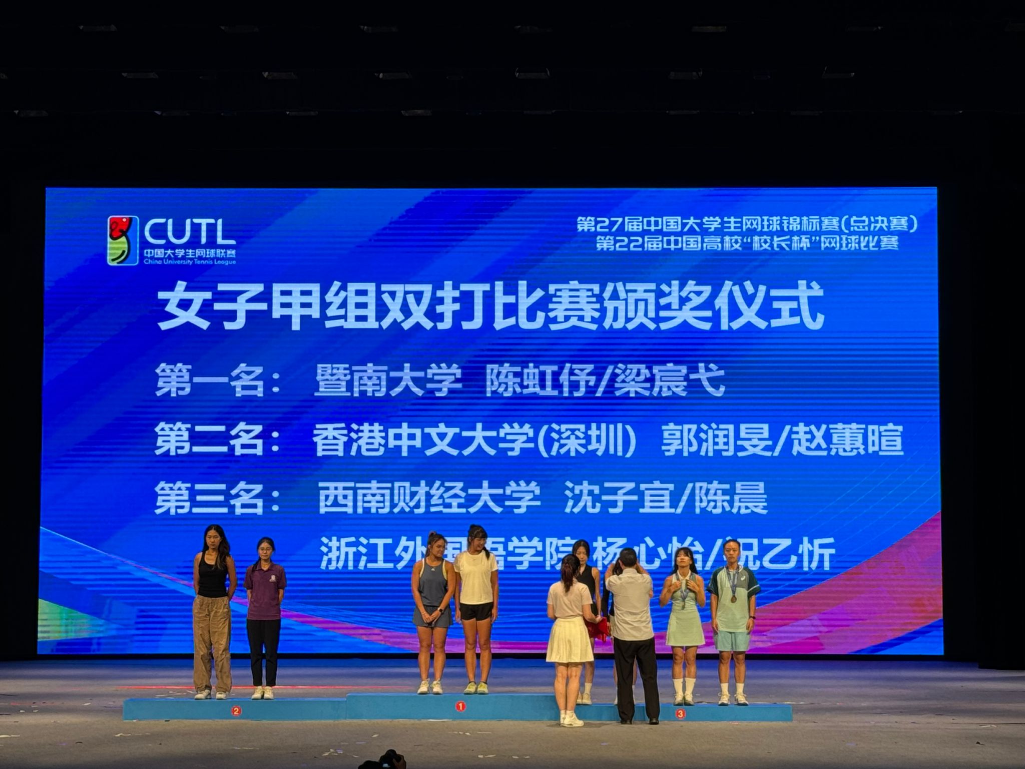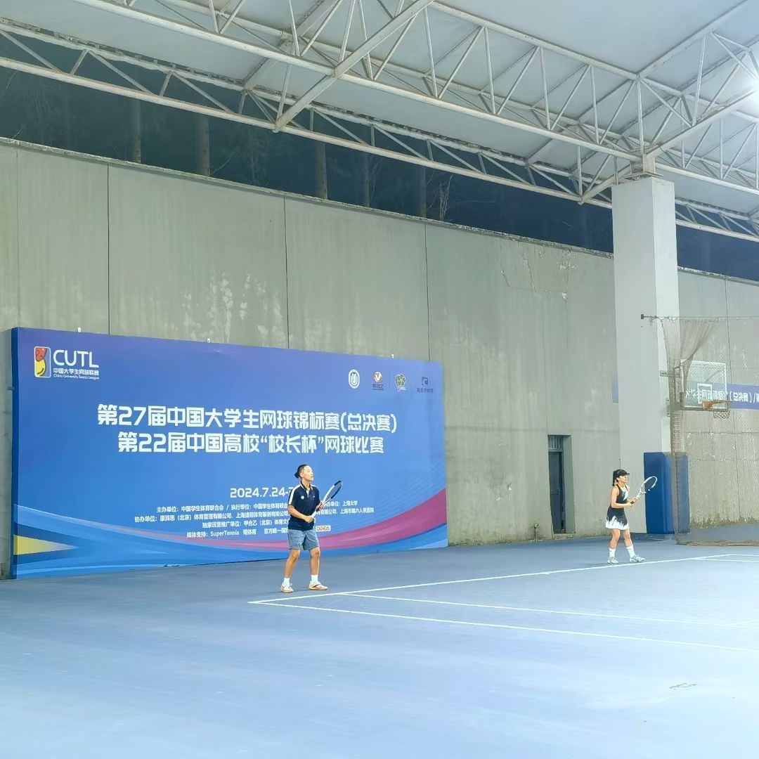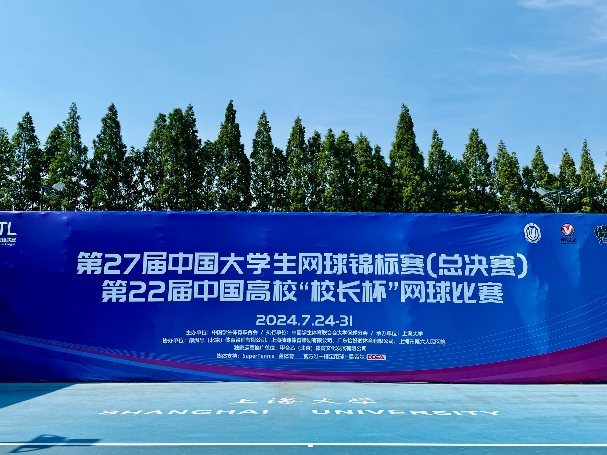 7月22日-8月1日,第27届中国大学生网球锦标赛(总决赛)在上海大学(宝山校区)举行。中国大学生网球锦标赛是我国大学生层面最顶级的网球赛事,经过八大分区赛的激烈角逐,在本届中国大学生网球锦标赛(总决赛)中,共有来自全国132所高校的915名同学成功晋级总决赛。参赛规模创历史新高!爱体育(中国)网球队在前期分区赛上表现突出,成功晋级总决赛,11名运动员代表学校参赛,孙巨杉、施泓宇、孔星宇担任教练。经过八天的激烈角逐,西财健儿们在强手如林的赛场上顽强拼搏,团结奋进,获得女子普通高校甲组双打季军和女子高水平乙组双打季军的好成绩,充分展现了西财学子的精神风貌和青春风采,为即将到来的西财百年华诞献礼!