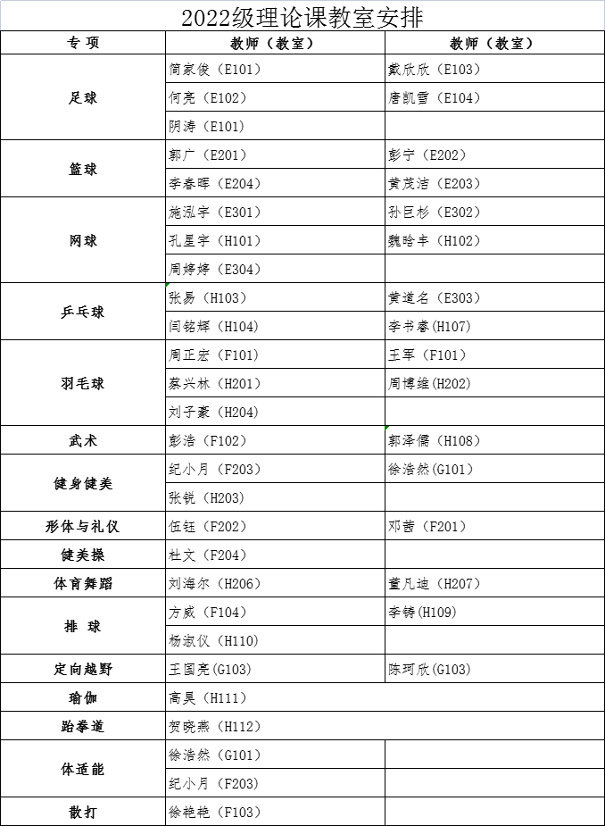 各学院: 经教务处同意,本学期2022级本科生第1周体育课为爱体育(中国)理论课,9月18日起恢复户外教学。根据教室资源状况,现将理论课具体安排通知如下: