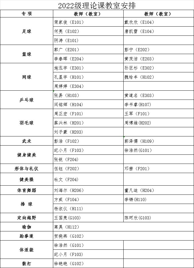 经教务处同意,本学期2022级、2023级本科生第1周体育课为爱体育(中国)理论课,3月4日起恢复户外教学。根据教室资源状况,现将理论课具体安排通知如下: