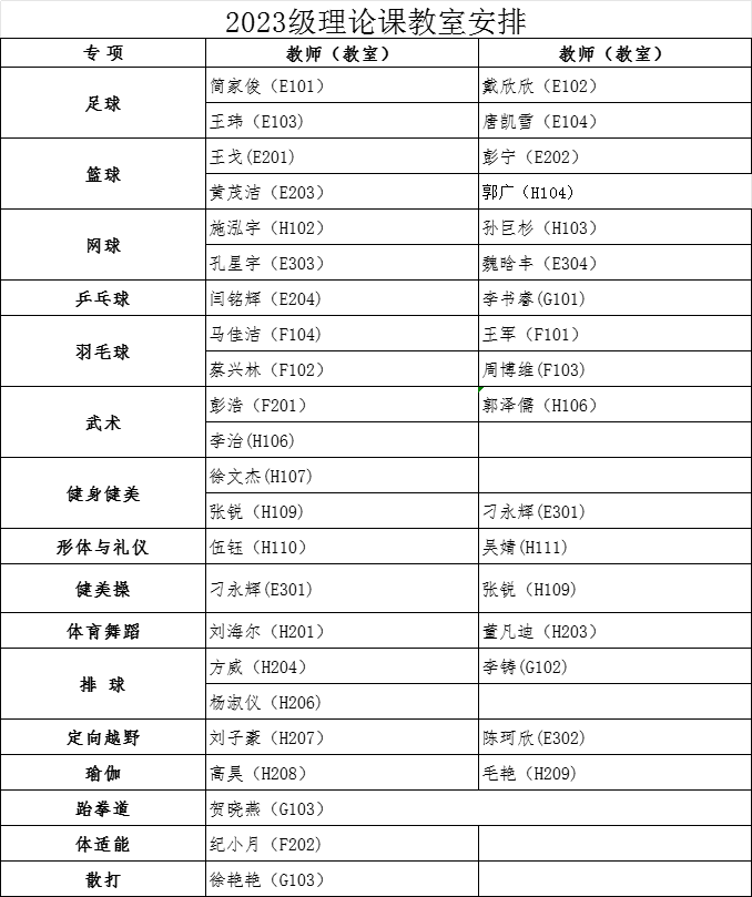 经教务处同意,本学期2023级本科生第1周体育课为爱体育(中国)理论课,9月14日起恢复户外教学。根据教室资源状况,现将理论课具体安排通知如下: