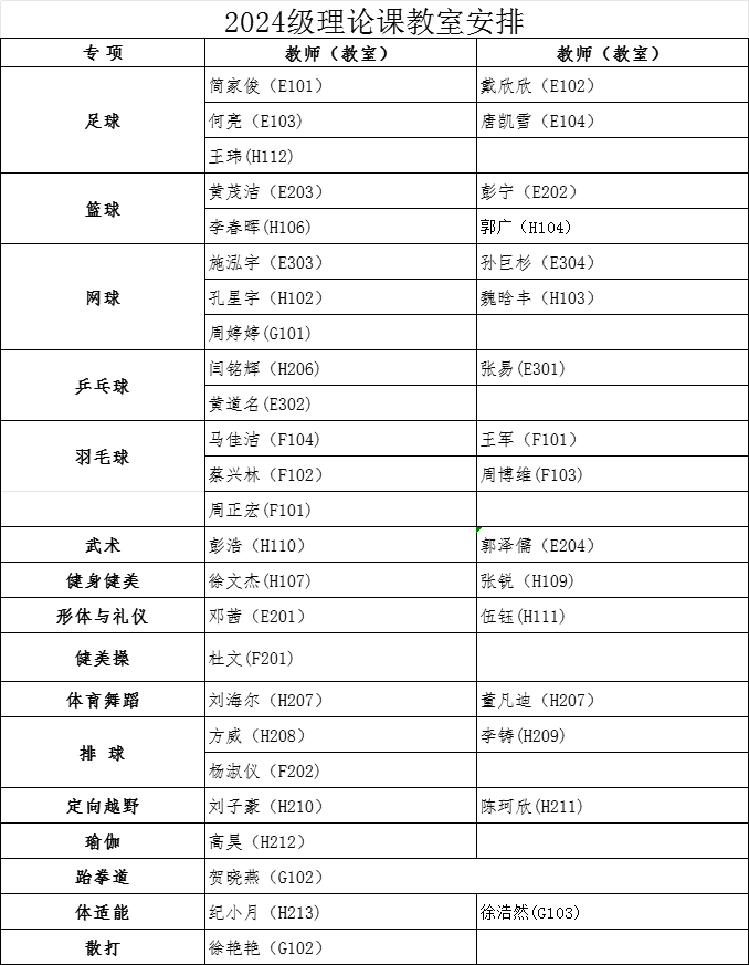 经教务处同意,本学期2024级本科生第3周体育课为爱体育(中国)理论课,9月29日起恢复户外教学。根据教室资源状况,现将理论课具体安排通知如下: